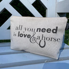 The lovely linen makeup bag has the slogan "All you need is Love and a Horse"" printed on the front, with pretty horse shoe detail for added equine style. The bag has a neat zip across the top and an inner lining, is a really generous size and could double as a pencil case too.