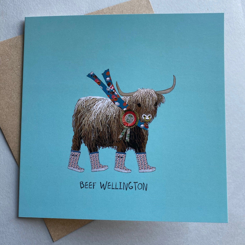 We love this lovely design by Sally Scaffardi - The Beef Wellington Greeting Card pictures a really fun highland cow in wellies, with a first prize rosette, on a vibrant blue background. The card is blank inside for your own message. Great for Birthdays, anniversaries, thank you's and invites!