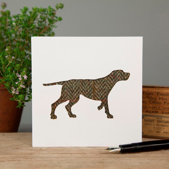This Country Tweed Pointer Greeting Card is a really stunning design of greeting card, made completely by hand in the UK. The carefully cut-out image of a Pointer dog exposes the beautiful rich green textured wool tweed fabric beneath to create a most unusual and tactile greeting card. Each card uses a different cut of fabric so may vary slightly from the image shown but every one is therefore unique.