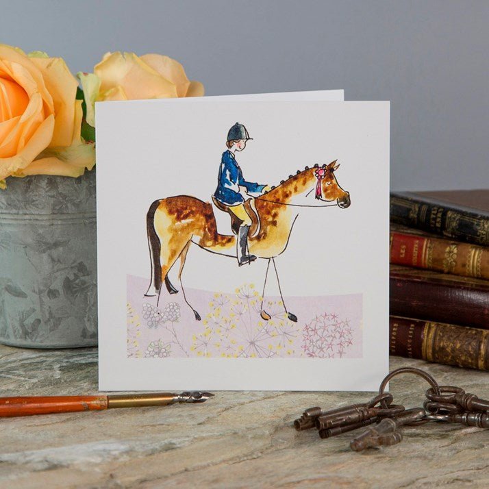 This lovely 'In The Ribbons' Greeting Card features a beautiful pen and watercolour illustration of a happy equestrian partnership sporting their winners' red rosette by talented artist Isobel Bushell.
