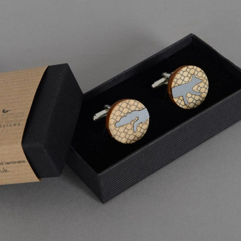These cufflinks are designed and hand crafted in Britain using sustainably sourced and reclaimed materials. British animal silhouettes, funky geometrics and a delicious colour palette are firstly illustrated and then developed to create eye-catching jewellery and stationery.