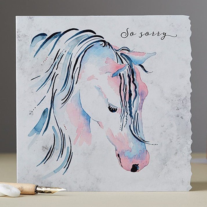 This So Sorry Horse Card is a lovely fine quality greeting card from Deckled Edge Design featuring a beautiful image of a horse from a hand-drawn illustration in soft muted colours. Finished with a stylish textured edge.