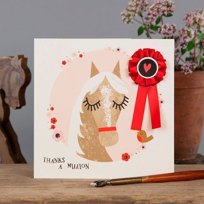 This beautiful 'Thanks A Million' Horse Design Greeting Card is designed and produced in the UK by talented artist Jo Burrows. We just love the real red satin ribbon rosette feature with cute heart illustration - guaranteed to bring a smile to the face of any horse lover!