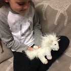 This soft and cuddly Steiff's Friends Floppy Unica Unicorn is made of white plush fabric with three elaborately embroidered stars on her hind quarters. With blue eyes, detailing on the nostrils and ears, it is a truly adorable gift. A longer plush fabric is used for the main and tail and beanbags in the hind quarters and hooves give the unicorn perfect stability. Topped off of course with a silver horn! A perfect present for any young prince or princess.