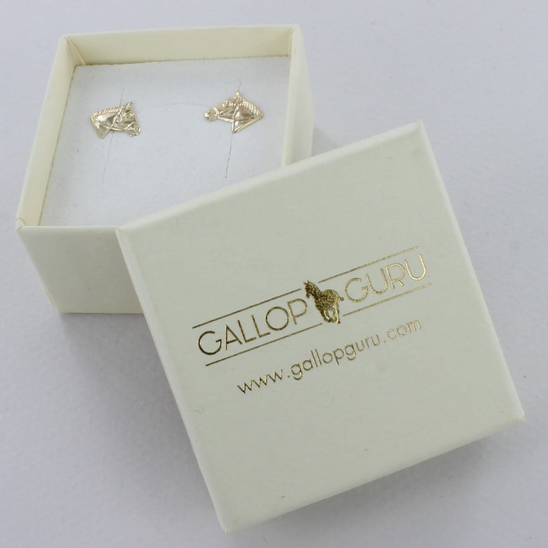 These 9ct Gold Horses Head Stud Earrings are extremely charming and a great pair of earrings for every day wear. The exquisitely crafted horse heads have delicate detailing and a very captivating shiny finish to them. These studs are crafted from high quality 9ct gold giving them a charming pop of colour to add to any outfit. These studs will be lovely for younger or older wearers, the perfect gift for all horse and pony lovers! The studs will come beautifully presented in a stylish Gallop Guru presentation box ready for gifting.