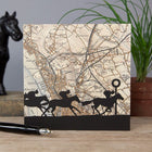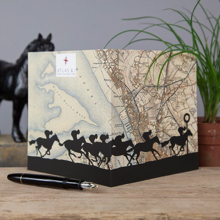This Aintree Horse Racing Map Card is a stunning greeting card featuring artistic silhouettes of race horses and riders galloping past the finishing post at Aintree. The vintage Ordnance Survey map background of Aintree and surrounding areas adds a creative, modern twist to wonderful effect.