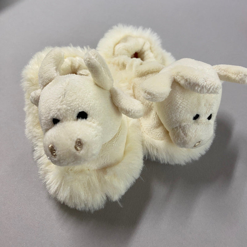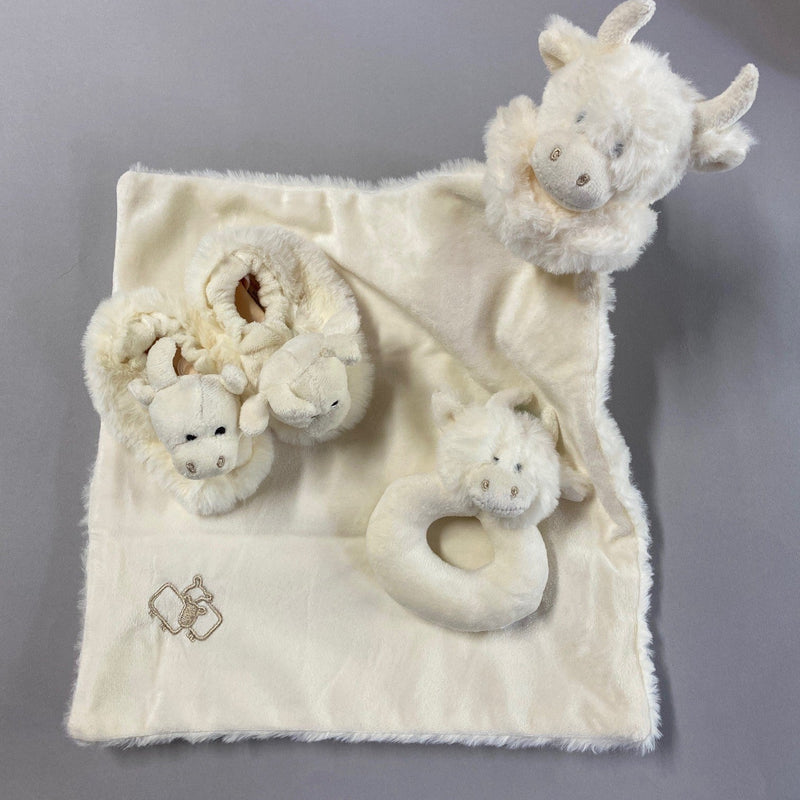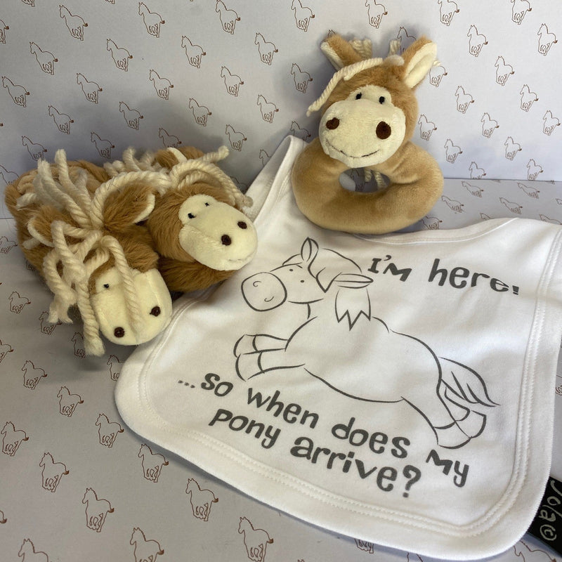 Choose from a Pony or Highland Cow theme. Each box includes three adorable items, all suitable for a new baby. A lovely rattle, a gorgeous pony cuddly toy, a cheeky Bib and this "oh so soft" pair of baby sized slippers, and will be adored for evermore. Perfect for a new born baby gift.