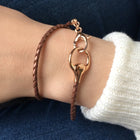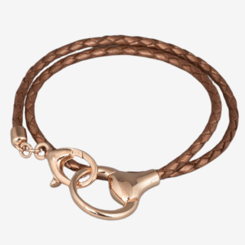 This Bronze Leather and Rose Snaffle Wrap Bracelet by Gemma J is an exquisite addition to our jewellery range and a staple for any jewellery box! The bronze genuine leather strap is woven in design, and encircles the wrist twice to create the double style. The leather is finished with a sterling silver and rose gold vermeil (plated) half snaffle design at one end which the clasp can then be attached to to secure the bracelet. A subtle but eye-catching bracelet that just oozes with equestrian style.