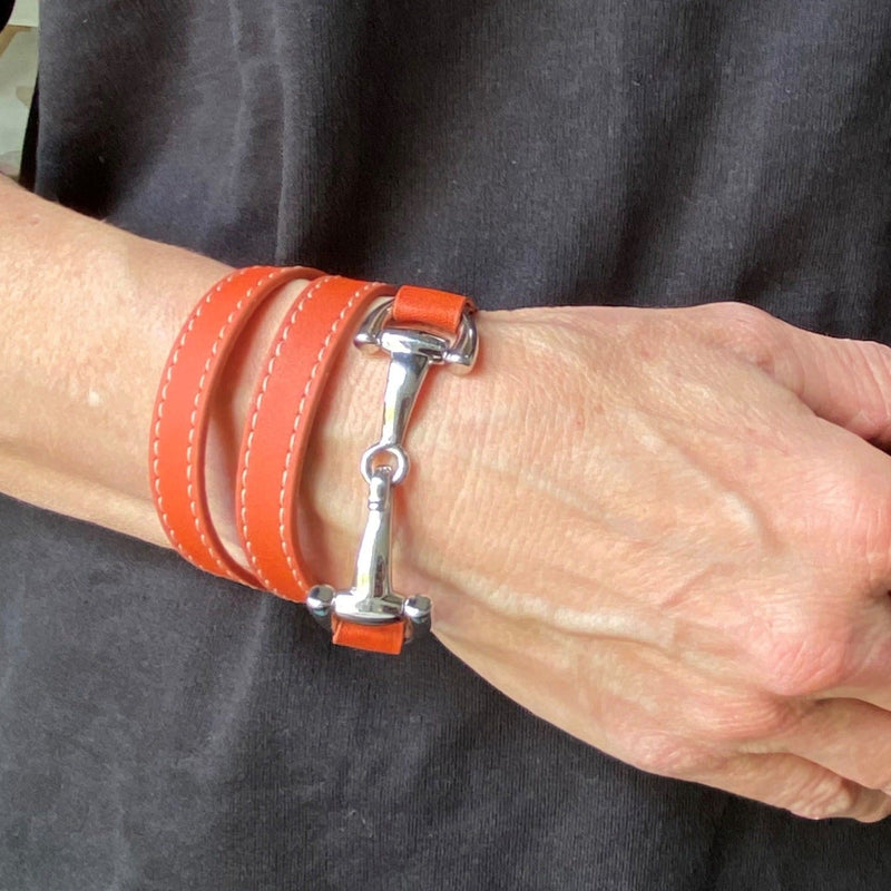We love this Burghley Orange Genuine Leather and Stainless Steel Bracelet by Dimacci and it would make a perfect gift for the fashion conscious Equestrian. The burnt orange leather strap is finished with contrasting white stitching, and encircles the wrist three times to create this eye catching and stylish design. The leather strap has a high shine, yellow gold plated snaffle as the central detail. The snaffle cleverly doubles as the clasp making it easy to take on and off with one hand, and sits perfectly on the wrist when worn. This bracelet looks great with a variety of outfits, and is a fab statement piece to be worn alone, or stack with other bracelets in our range to create a fun and unique look.