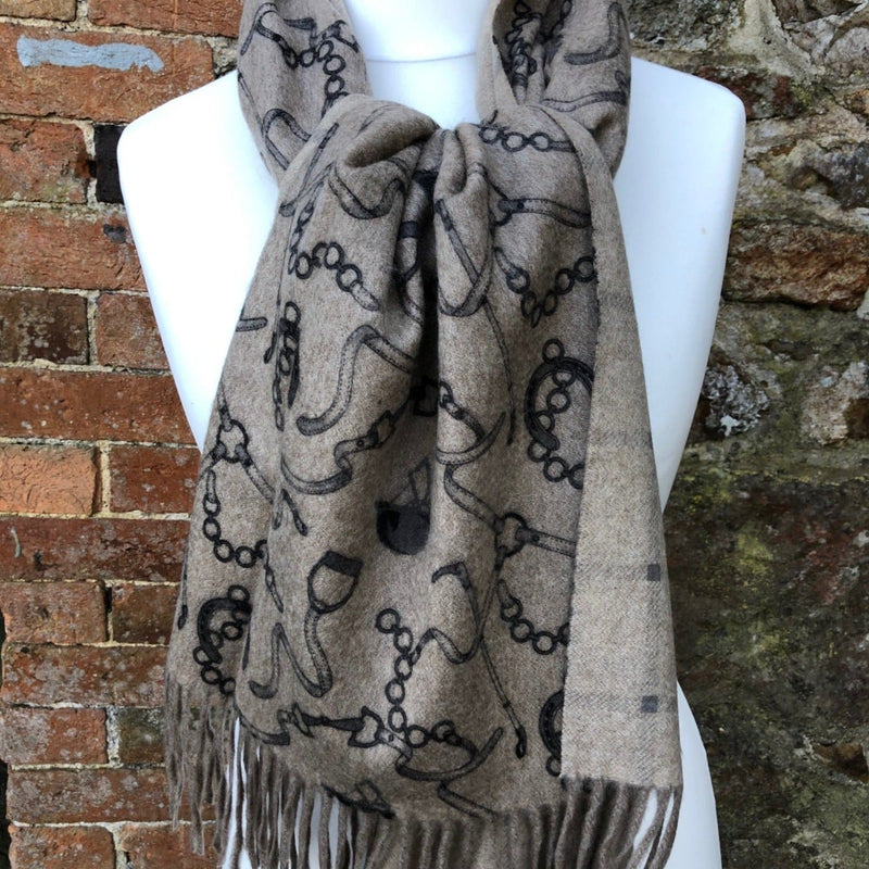 The most gorgeous and luxurious Cashmere Equestrian Wrap or Scarf, soft to the touch and a wonderful, versatile addition to your outfit. The stylish equestrian print with classic fringing make this scarf a timeless wardrobe staple, a beautiful product of the very best quality and design.