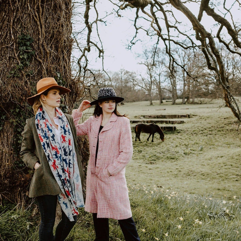 Extremely versatile, the wrap can be worn in lots of different ways and will be oh so useful to keep out the cold. We have designed this scarf with Red and Navy galloping horses printed on a subtle grey background, colours that will compliment all your lovely outfits, and it is exclusive to us!