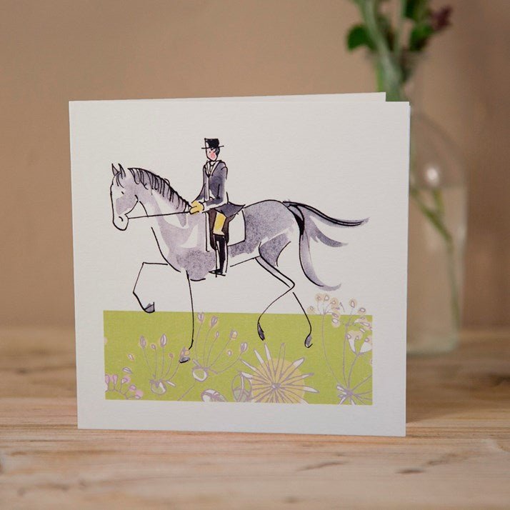 This lovely Collected Trot Dressage Greeting Card features a beautiful pen and watercolour illustration of a grey dressage horse and grand prix rider by talented artist Isobel Bushell.