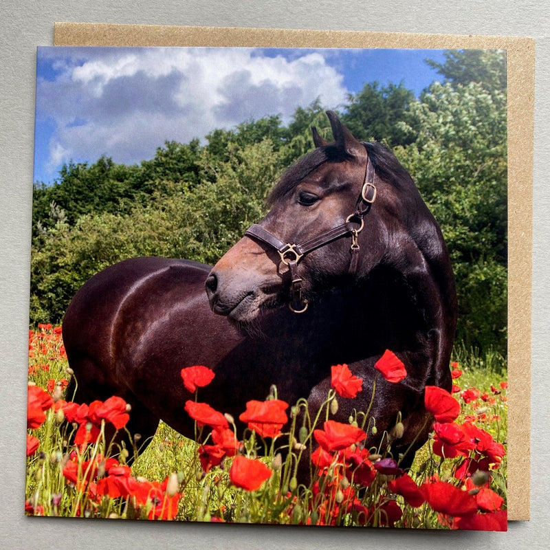 This beautiful "Horse and Poppies" Equestrian Greeting Card is created using an original image taken by talented equine photographer Alex Sharp. A beautiful dark bay horse stands amongst the poppies, with a lovely blue sky above. The card is blank inside so perfect for lots of different uses.