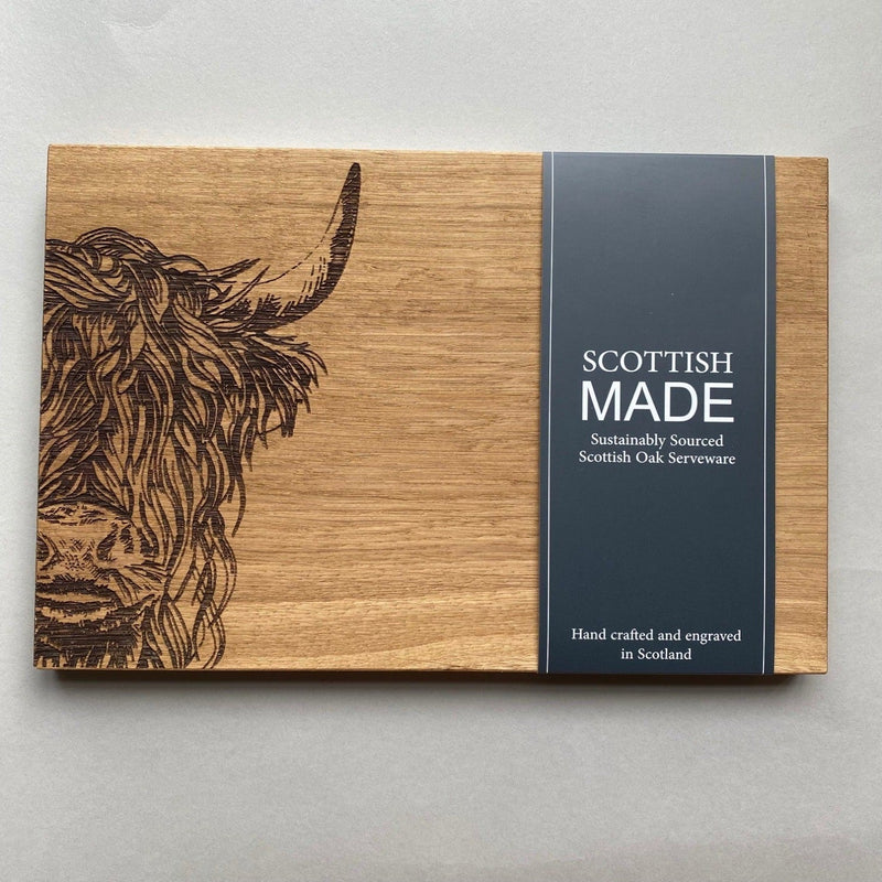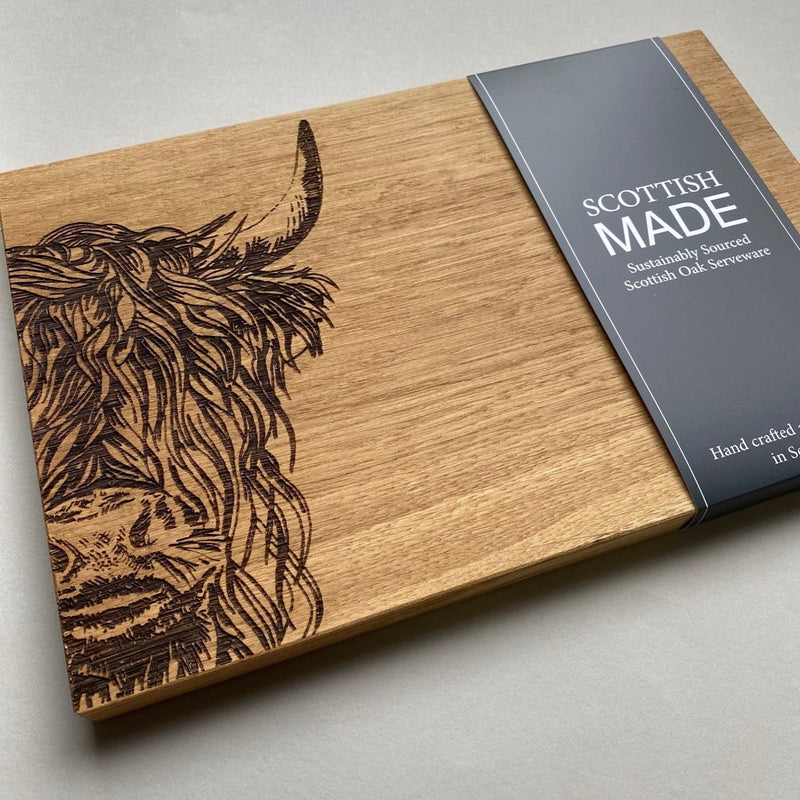 The "Highland Cow" Oak Chopping Board features an etching of a highland cow, this beautiful oak chopping board will add country charm to your kitchen or dining table. Hand crafted from Scottish oak, this generous sized board will be wonderful to chop on or serve cheese, breads, antipasti and all other yummy goods! A very impressive addition to your table when entertaining at home.