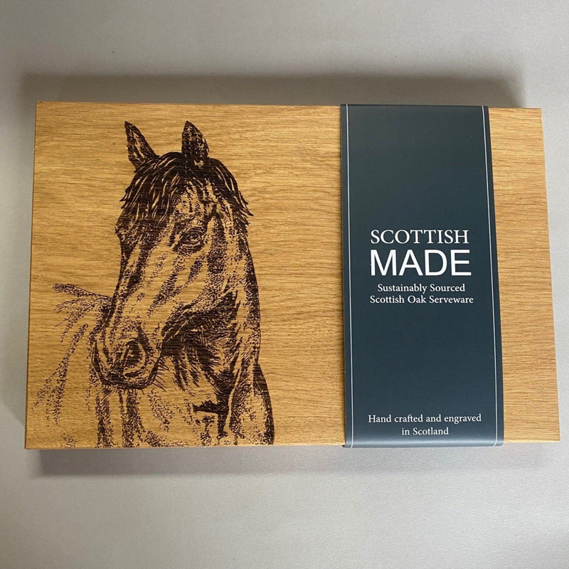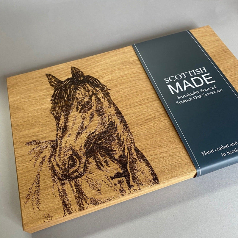This smart "Horse Portrait" Oak Chopping Board features an etching of an imposing horse head. This beautiful board will be wonderful to chop on or serve cheese, breads, antipasti and all other yummy goods! A very impressive addition to your table when entertaining at home.
