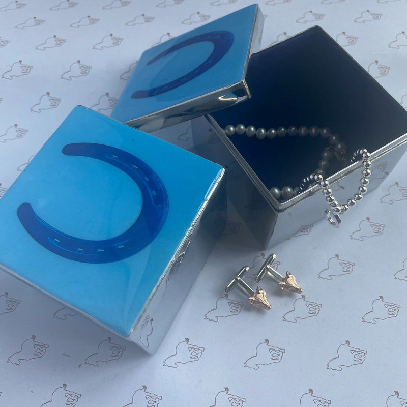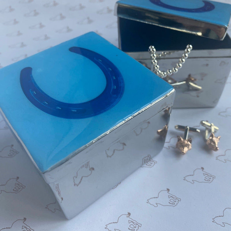 We love this new Enamelled Horseshoe Large Trinket Box which we designed and had especially for us! Its very smart, with a lovely pop of bright blue colour, incorporating a horseshoe on the top. Its a lovely size, so perfect for lots of different things; jewellery, a desk tidy, paper clips, on a dressing table or on a coffee table. The list is endless! The box is lined with soft navy fabric to protect the contents.