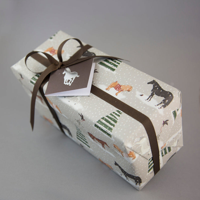 • Gift box is finished with festive horse themed wrap and a sparkly gift tag