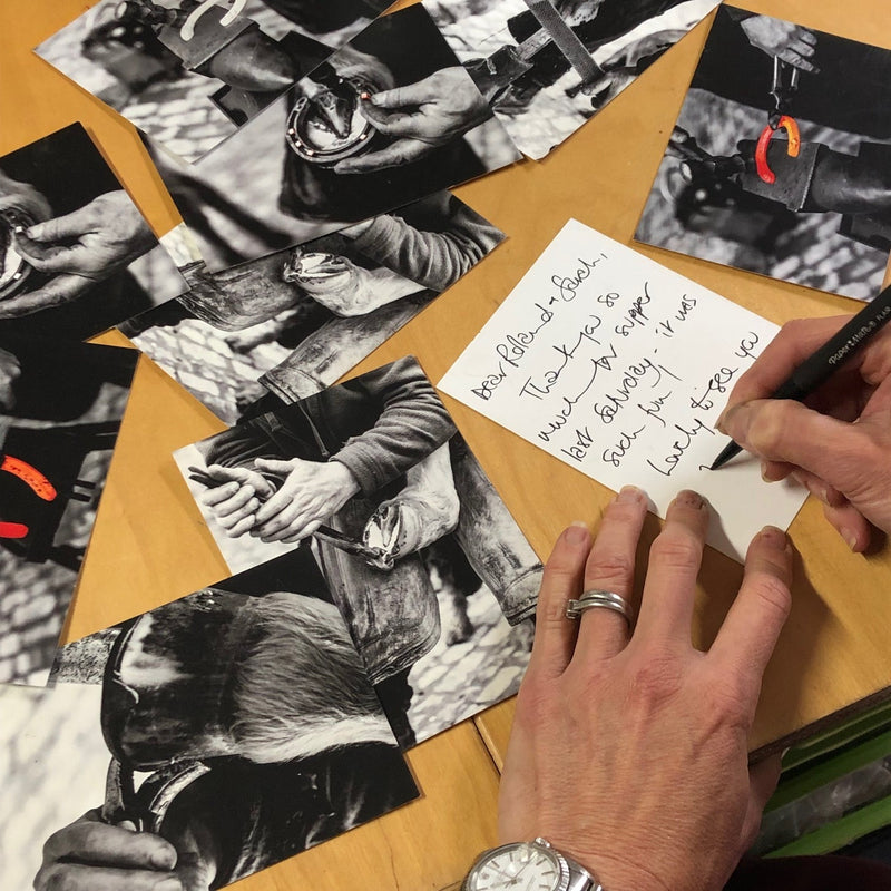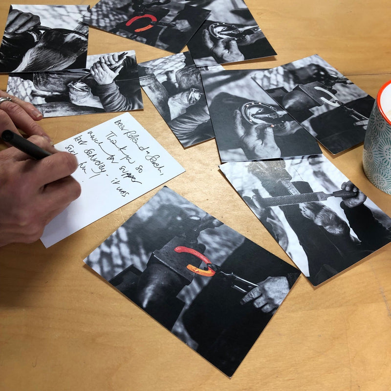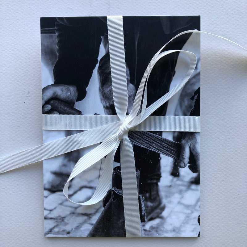 The Forge Fired Images Set of 6 Postcards are a wonderfully atmospheric collection of 6 black and white images showing our very own farrier hard at work. Each image shows a different part of the shoeing process: 'The Trim', 'Rasping', 'Red Hot Shoe', 'Burning On', 'Nailing' and 'Clenching and Finishing'.