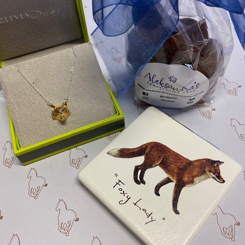 This superb gift box contains a Sterling silver Fox Mask necklace with 18k Gold detail, a Fox design handbag mirror and some delicious heart shaped chocolates.