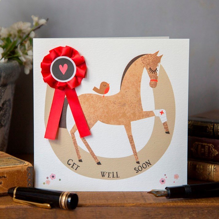 This 'Get Well Soon' Greeting Card is a super fun, modern but stylish card, designed and manufactured in the UK by talented artist Jo Burrows. We just love the real red satin ribbon rosette feature and the horse with a poorly leg is a brilliant image for a Get Well Soon card!