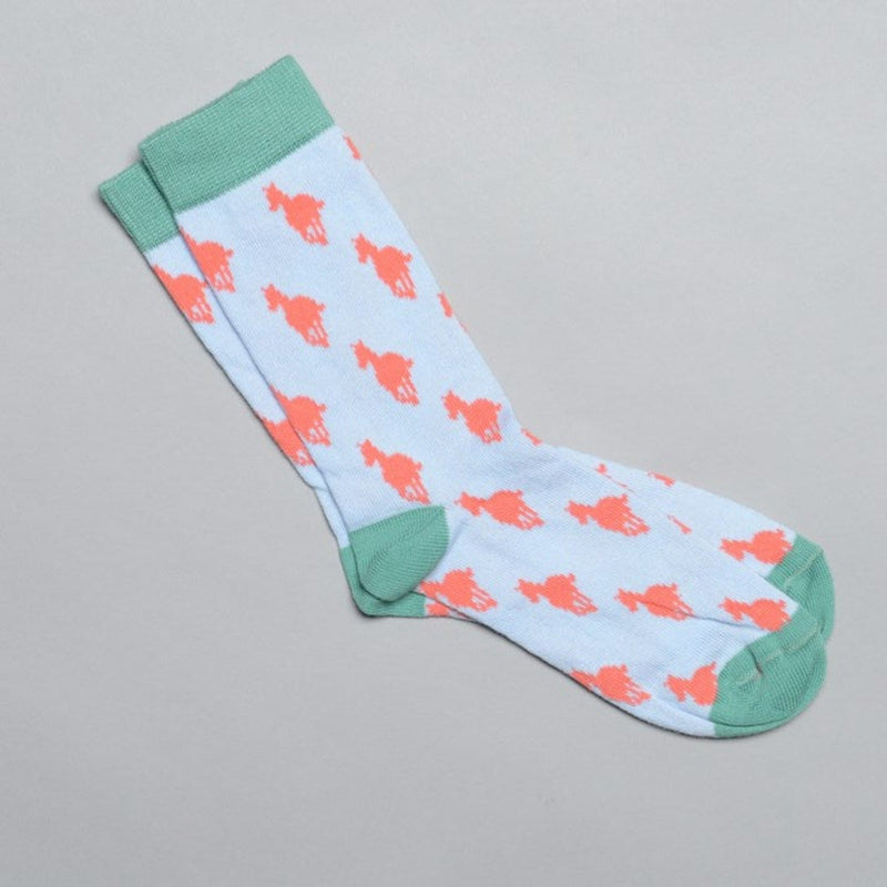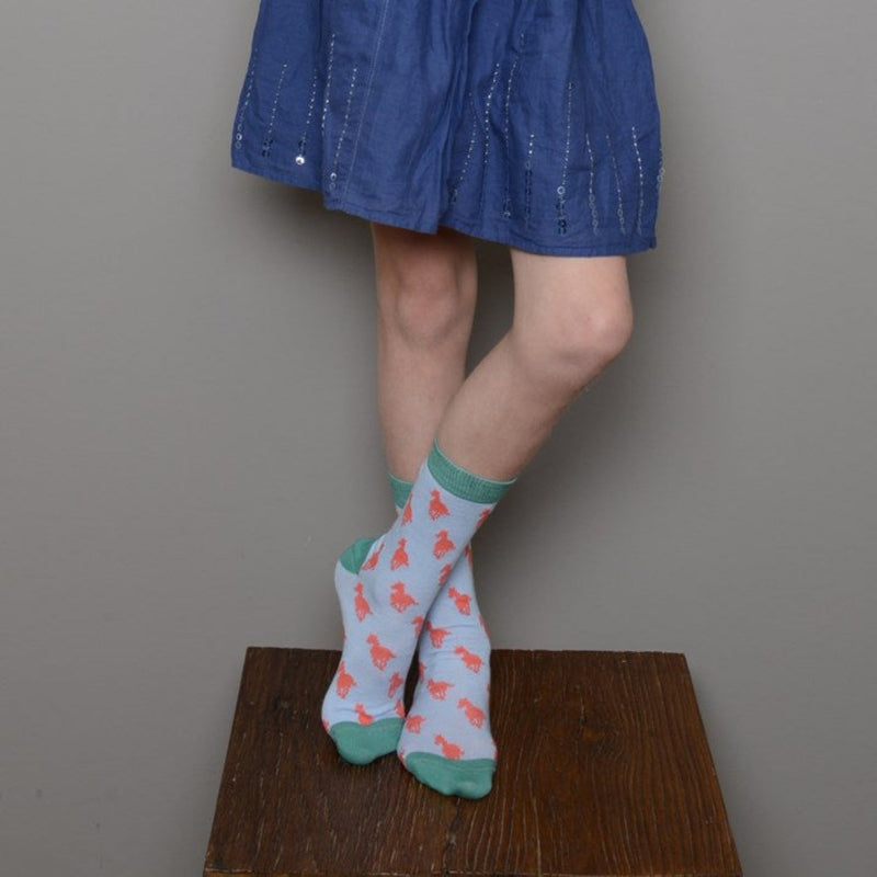 The fun and stylish cotton socks are perfect for everyday wear with their soft, stretchy and incredibly comfortable fabric. Featuring funky apricot galloping horses on a bright sky blue background with jade top rib, heel and toe. Perfect as a present on their own or as part of a hand-picked mixed gift-box.