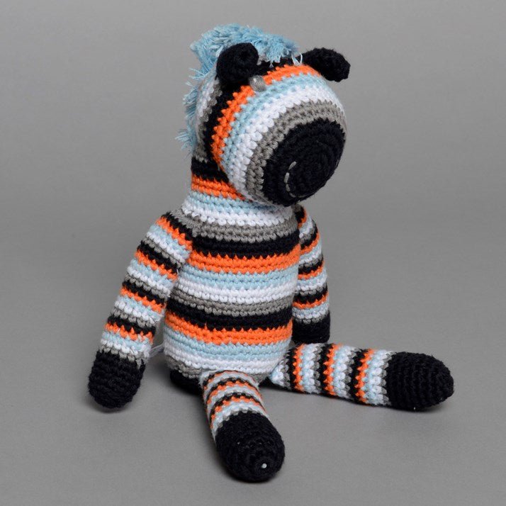 A gorgeous little stripy Hand Crocheted Stripy Zebra with a cute rattle inside. The perfect gift for a new baby or little equine-lover.