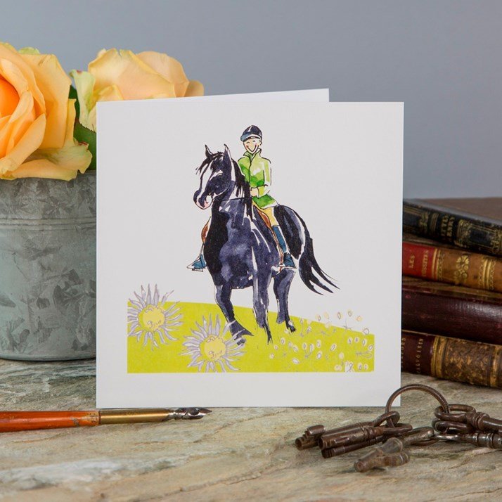 This lovely 'Happy Hack' Greeting Card features a beautiful pen and watercolour illustration of a very happy hacker and her trusty steed trotting through a wild flower meadow by talented artist Isobel Bushell.