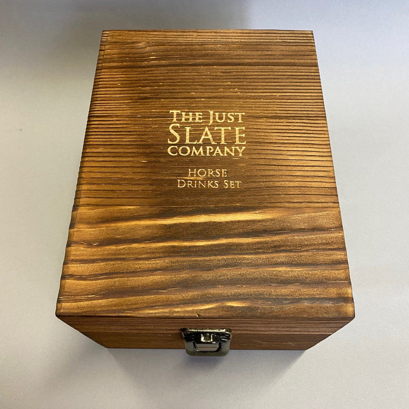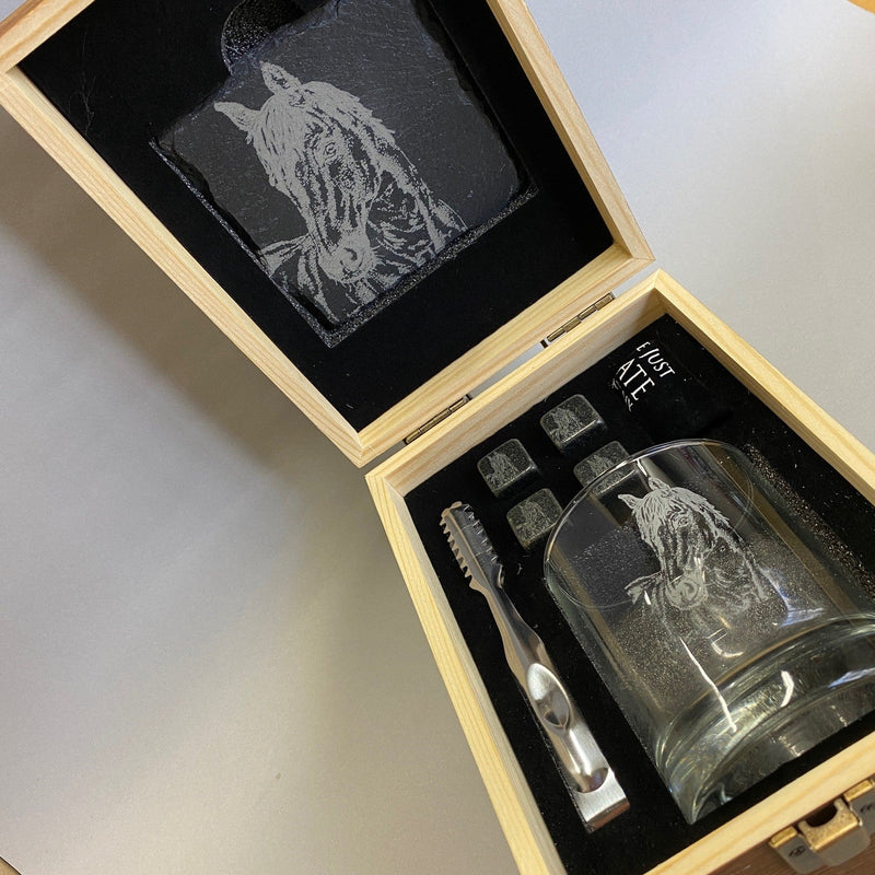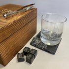 This is really rather lovely, a Highland Cow Etched Glass and Drinks Set in a smart, wooden presentation box. The set comprises an elegant tumbler, a matching slate coaster, 4 "ice cubes" and a set of tongs. Perfect for your favourite tipple, be it a gin, rum or whiskey.