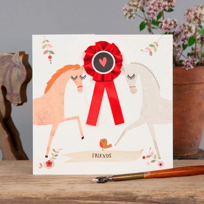 This Horse Friends Greetings Card is perfect a horsey friend! This is a super fun, modern but stylish card, designed and manufactured in the UK by talented artist Jo Burrows. We just love the real red satin ribbon rosette feature - guaranteed to bring a smile to the face of any age of horse lover!