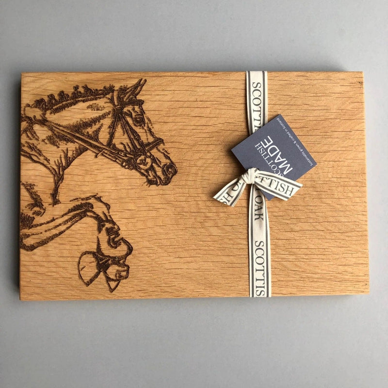 The "Jumping Horse" Oak Chopping Board features an etching of a jumping horse, this beautiful oak chopping board will add equestrian charm to your kitchen or dining table. Hand crafted from Scottish oak, this generous sized board will be wonderful to chop on or serve cheese, breads, antipasti and all other yummy goods! A very impressive addition to your table when entertaining at home.