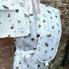 These are rather fabulous new Horse Themed Oven gloves, designed and made in the UK, with an attractive all over equestrian themed print. Double ended and lined in a smart stripe, these oven gloves are sure to brighten any horsey or country kitchen. There is also an apron and a tea towel to match.