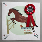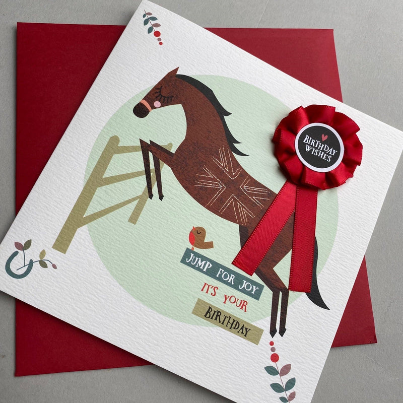 This 'Jump for Joy' Horse Design Birthday Card is a wonderfully designed card and produced in the UK by talented artist Jo Burrows, featuring a really cool jumping horse illustration. We just love the real red satin ribbon rosette feature with cute heart and birthday wishes greeting.