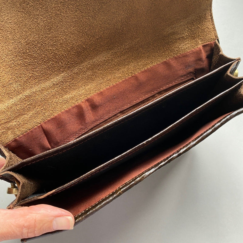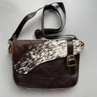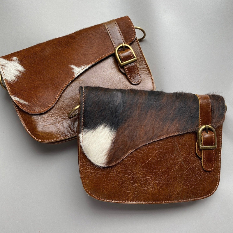 Stylish and useful, a Leather and Cow Hide Cross body bag. This bag is smart, a handy size with three interior sections and one zip pocket, a long, adjustable strap that is detachable. The front of the bag is styled on a saddle, with stirrup buckle detail, giving it a lovely equestrian feel. The bag can be used as a clutch without the strap so very versatile.
