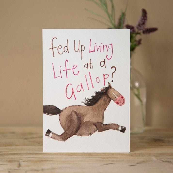 The 'Life at a Gallop' Horse Greeting Card by Alex Clark, is a lovely greeting card features a charming illustrated galloping pony with the caption 'fed up with Living Life at a Gallop ?'