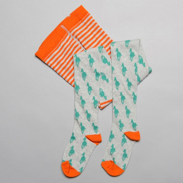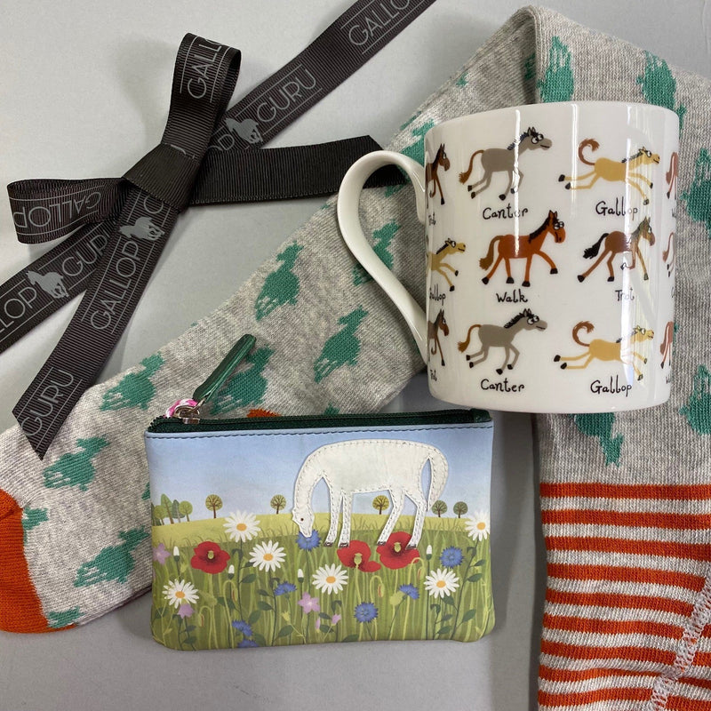 Our exclusive captivating Little Pony Lover Horsey Themed Gift Box contains our our exclusive Catherine Tough cotton horse tights in funky orange/grey/jade; a fine bone china New Ponies mug by Tyrrell Katz; and a lovely genuine leather 'Pony in a Meadow' zip purse.