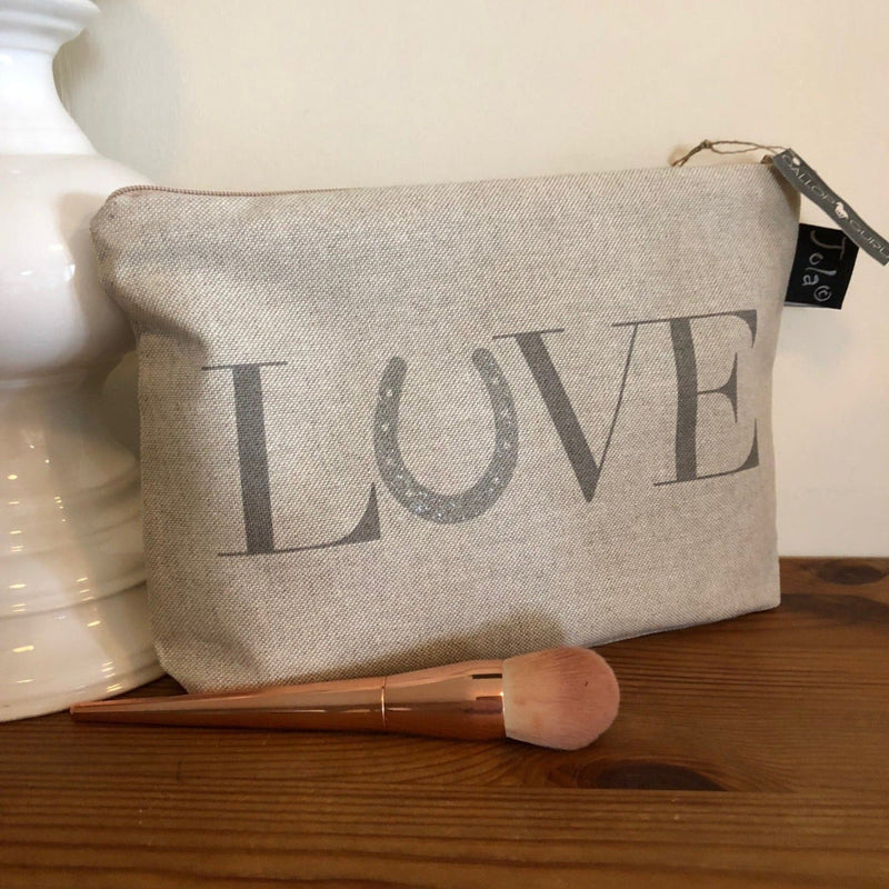 The lovely Linen Makeup Bag, has "LOVE" printed on the front with a little added glitter to add sparkle to your life! The 'O' is also a horseshoe to add equine style. This lovely linen bag could also double as a pencil case too, so versatile and a great token gift.