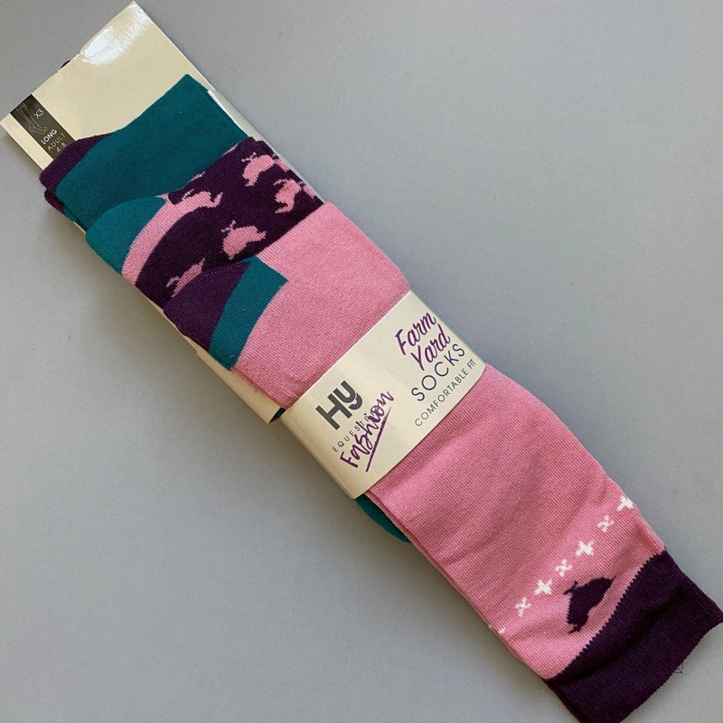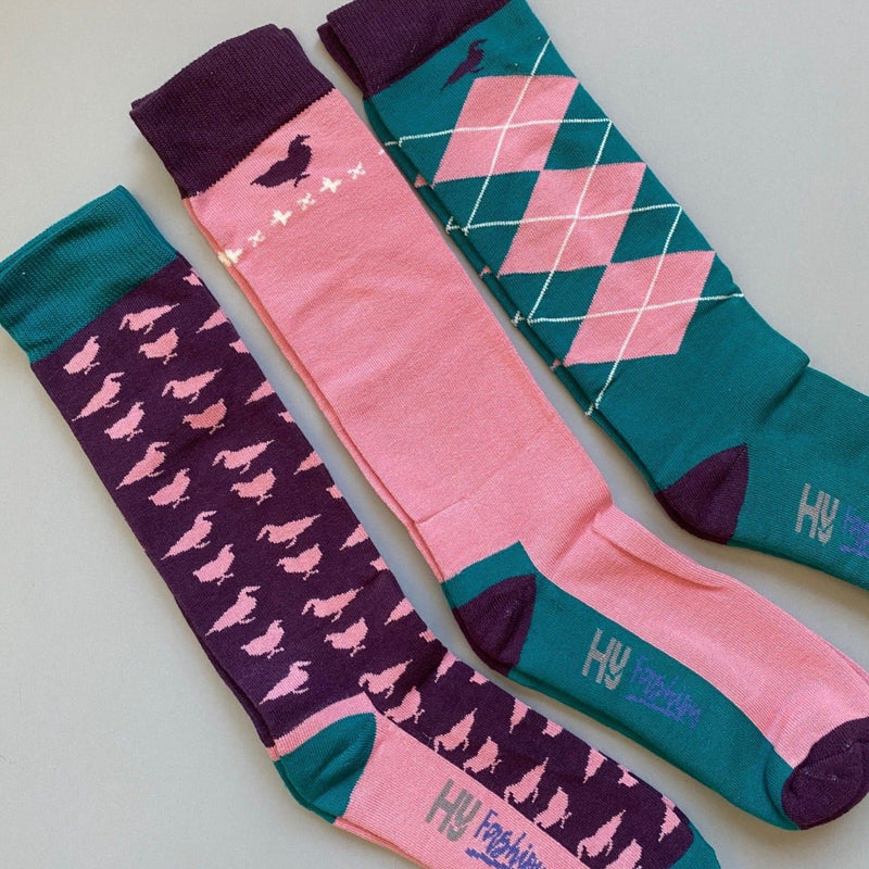 Fabulous Pink & Navy Long Riding Socks - 3 Pack by Hy Equestrian. Great fun designs are combined with wonderful comfort, with padded sole and bamboo for moisture wicking. The knee high socks are strong, stretchy, durable, soft and antibacterial.