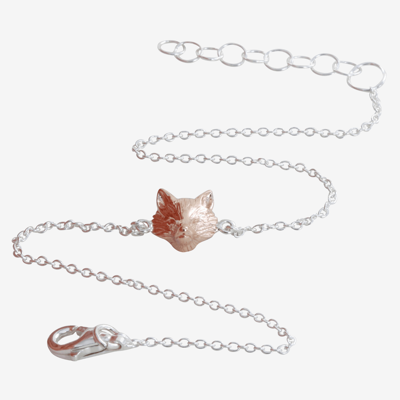 Our Sterling Silver and Rose Gold Fox Head Adjustable Bracelet is crafted from the finest quality sterling silver and has such exquisite attention to detail. The fabulous 18ct rose gold fox head charm sits centrally on a fine sterling silver link chain which encircles the wrist beautifully. The bracelet is adjustable to fit most wrist sizes and makes a perfect gift. Delicate in size, this bracelet is perfect for every day wear but will also turn the heads of those who set eyes on it due to its wonderful detail.