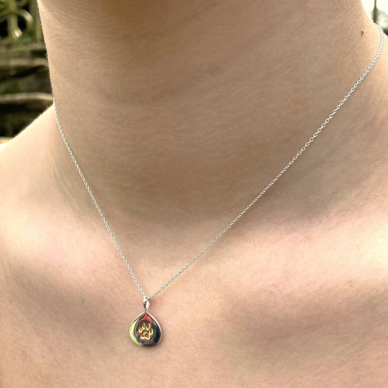 Our wonderful Silver Pawprint Necklace is adorable. The gold vermeil pawprint detail with a lovely little heart in the centre is a perfect homage to your furry friends! Looks great worn solo or with your favourite pendant.