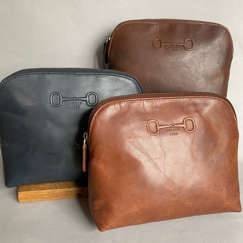 This really Smart Leather Washbag has stylish snaffle bit detail embossed on the front. It is fully lined with an interior and exterior pocket. The zip tabs make the pockets nice and easy to use and, being a good size will be useful for all your items when travelling away from home. Available in Dark Brown, Light Tan or Navy Blue.