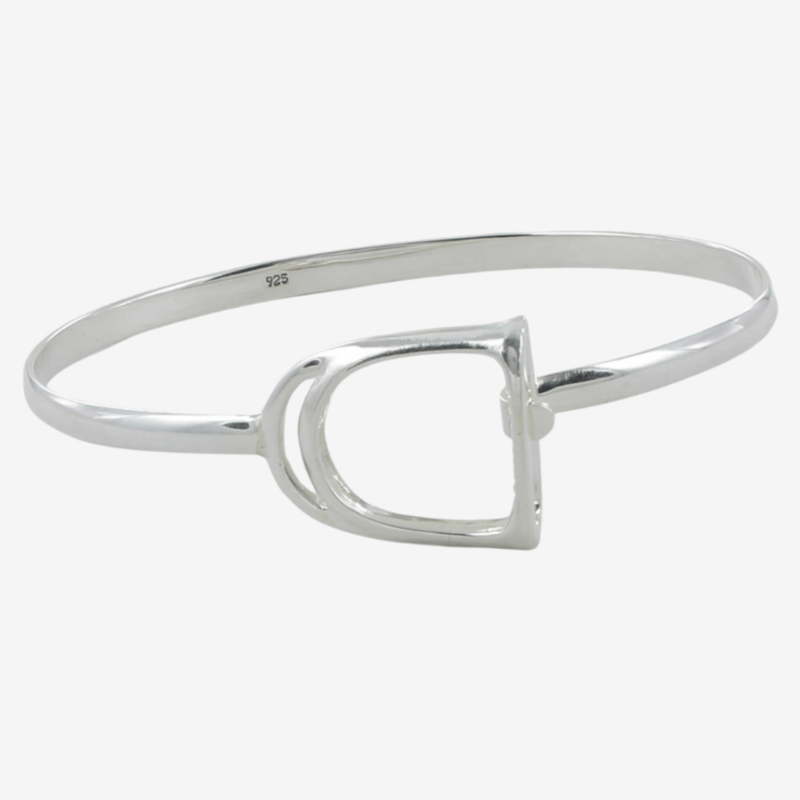The sterling silver band encircles the wrist beautifully and is finished with high shine stirrup detail on one end, and a hook clasp to fasten on the other.