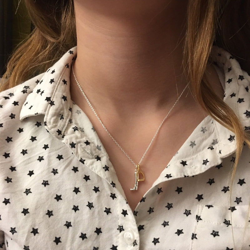 Our Sterling Silver Boot and Gold Stirrup Necklace is both stylish and captivating. The two charms are exquisitely crafted, one a sterling silver riding boot with a wonderful high shine finish, the other, a beautiful matt gold vermeil finished stirrup. The two contrasting finishes compliment each other perfectly and make this such an eye catching piece.