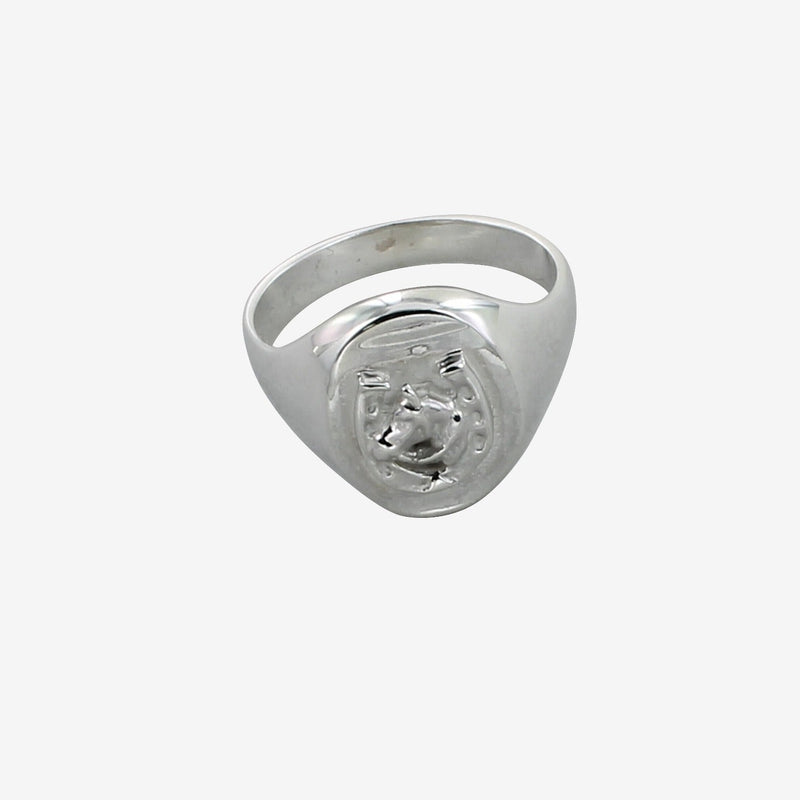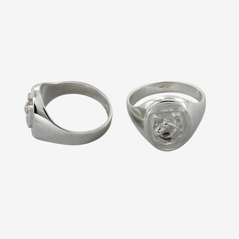 This rather smart Sterling Silver Signet Ring has a horsehead and horseshoe very detailed design on the front. It has a lovely high shine finish and is a very eye catching design. The ring is cast in sterling silver so is very robust.
