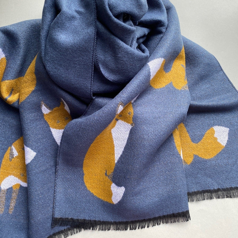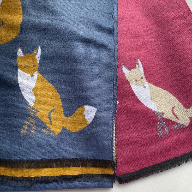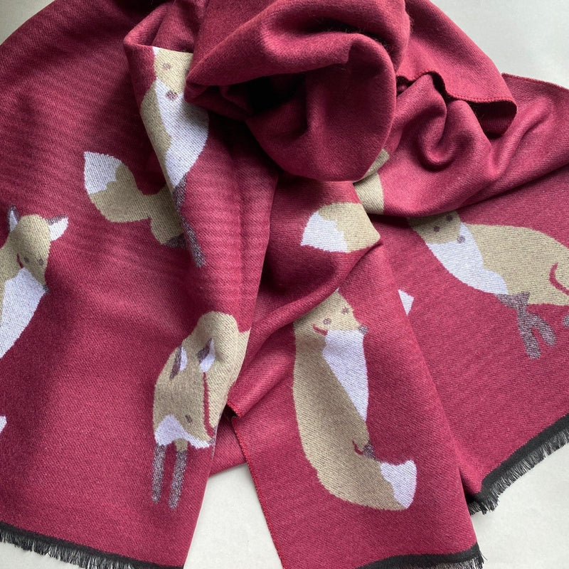 I love this bright and oh so warm Super Soft Foxes Scarf. Its a fabulous size 160cm x 170cm with an eye catching, woven fox design in contrasting colours and made from a wool and viscose mix. Choose from a Berry colour background or a soft navy. There is a neat fringe at either end of the scarf.