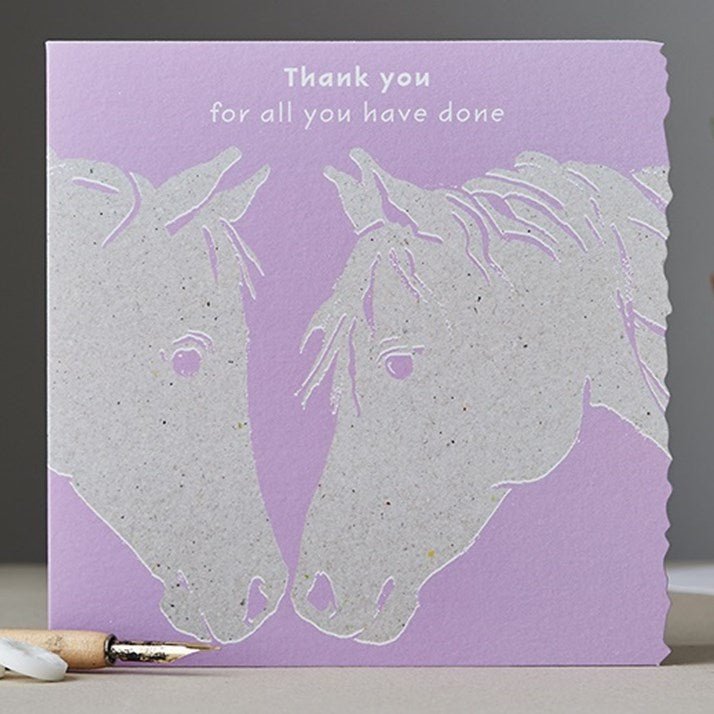 This Thank You Horse Card is a charming fine quality greeting card from Deckled Edge Design with a stylish texture finished edge. The caption, Thank you for all you have done, is written above the illustration.