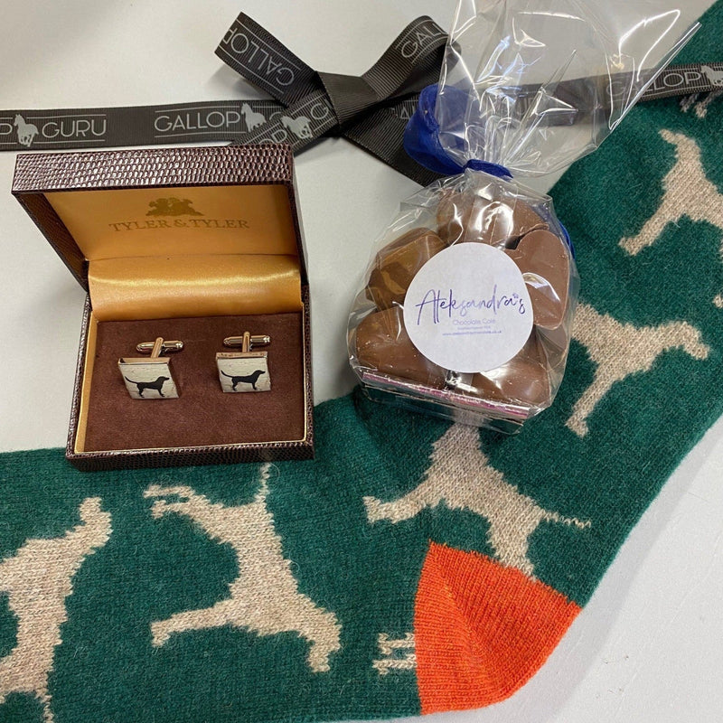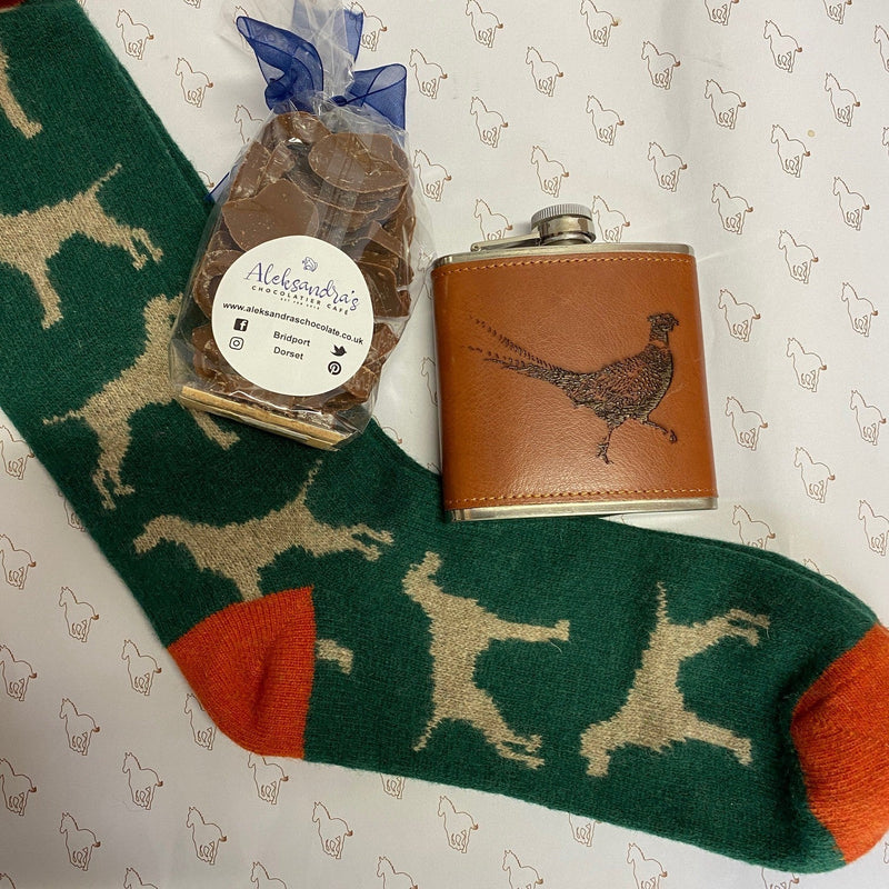 Our superb Countryman gift box contains 3 fabulous items to treat a chap of your choice! A lovely woollen pair of long socks in green adorned with hounds, a smart leather Pheasant themed hip flask and some heart shaped chocolates for an extra treat. All beautifully wrapped, boxed and tied with our embossed ribbon. Great for special Birthdays and Christmas.
