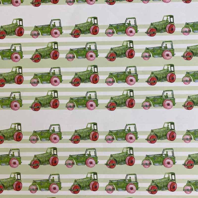 Tractor or Steam Roller wrapping paper - A perfect wrapping paper for the vehicle lovers, covered with Steam Rollers that look very like tractors! The green vehicles and big red wheels create quite a nostalgic look and will bring a smile to your face.