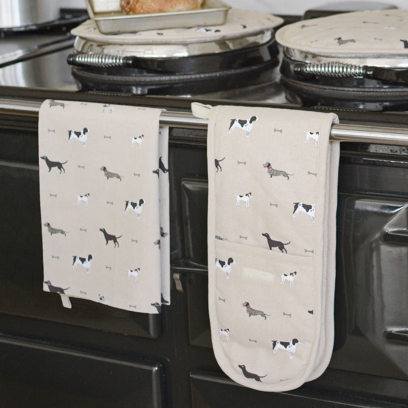 The oven gloves feature a cute collection of wire haired Dachshunds, Springer Spaniels, Cocker Spaniels, Black Labradors, Pugs, Jack Russells and Red Fox Labradors so perfect for any dog lover! The design sits against the wheat beige background and is a super stylish combination.